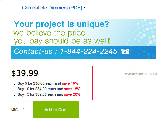 Lorsque vous achetez sur Lumenco.ca, la quantité commandée vous donne souvent droit à un rabais sur quantité! Si vous voulez savoir si le produit qui vous intéresse est éligible au rabais pour les grandes quantités, vous devez d’abord sélectionner le produit et regarder sous le prix affiché. Les items éligibles indiquent le rabais applicable en fonction de la quantité tel qu’affiché ci-dessous :